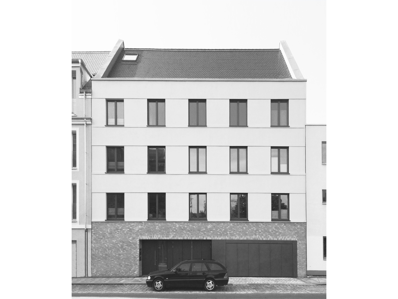 Die Fassade wurde in der Horizontalen durch ein Sockelgeschoss aus vorgeblendeten Klinkerriemchen und 3 darüber aufgehende Obergeschosse gegliedert. Die Putzfassade ist in hellen Grautönen gehalten, das geziegelte Satteldach in anthrazit.