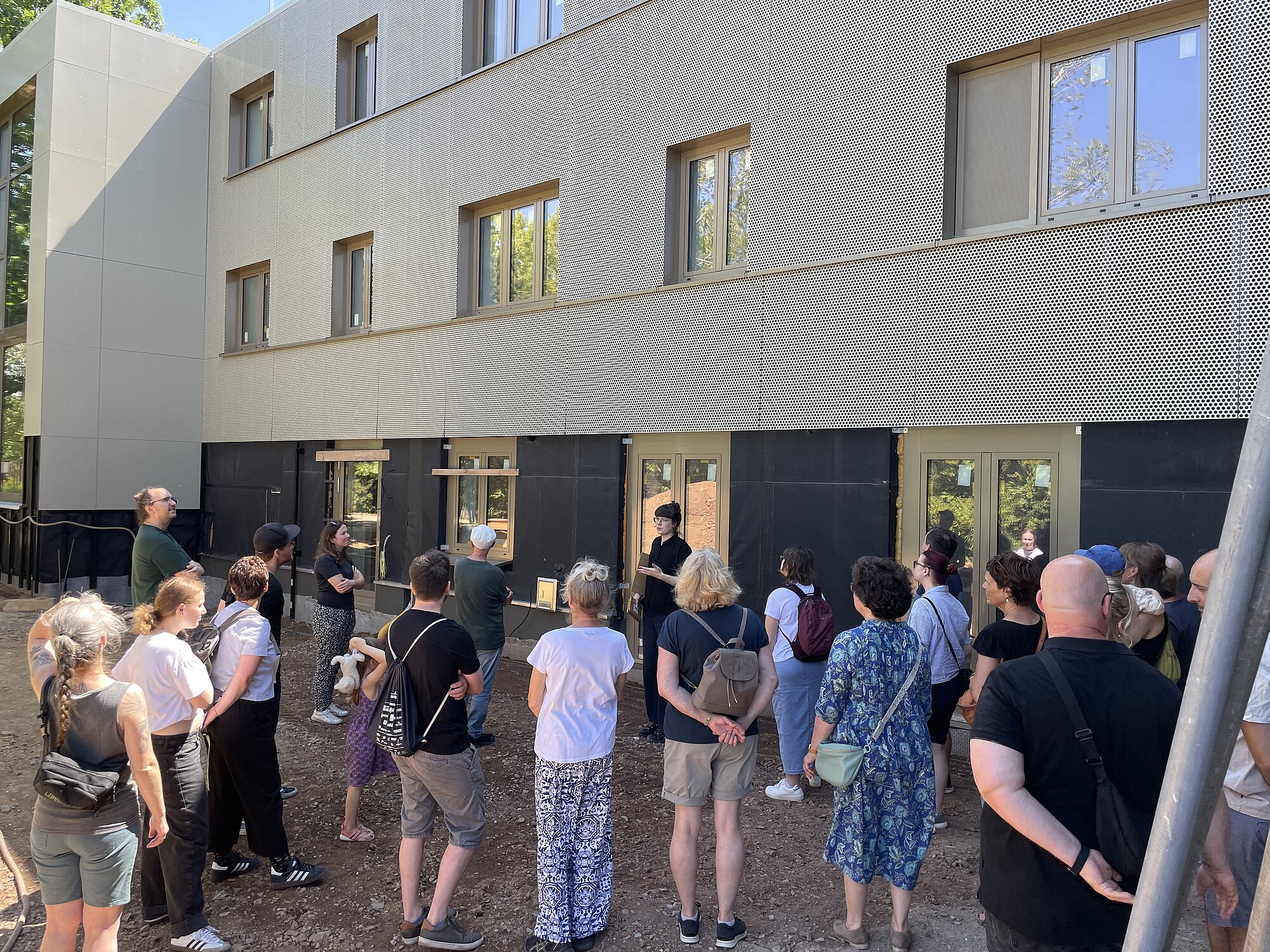 Mitte Juni konnten die Medienvertreter:innen im Psychosozialen Gemeindezentrum in Leipzig und im Beruflichen Schulzentrum für Wirtschaft Dresden „Prof. Dr. Zeigner“ live erleben, was den Tag der Architektur so spannend macht. Die Architektenkammer Sachsen hatte dafür zu Presseterminen vor Ort eingeladen. Bei der Gelegenheit berichteten die anwesenden Vertreter:innen von Vorstand und Kammergruppen auch über aktuelle Themen des Berufsstandes. Wir danken zudem den Vertreter:innen aus den beteiligten Büros (Irlenbusch von Hantelmann Architekten, AGZ Zimmermann Architekten GmbH und UKL Ulrich Krüger Landschaftsarchitekten) sowie den Bauherrschaften bzw. Nutzenden (Städtischer Eigenbetrieb Behindertenhilfe Leipzig, Landeshauptstadt Dresden, Amt für Schulen und Schulleitung BSZ „Prof. Dr. Zeigner“).